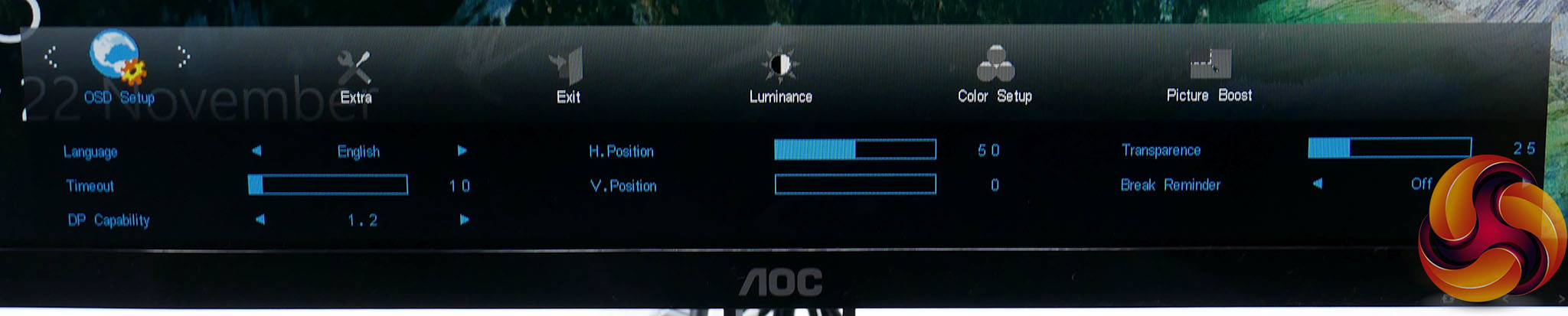 Next up is OSD Setup and it’s here you can change the language, timeout, position and transparency of the OSD. You can also change the DisplayPort to operate in v1.1 or v1.2 modes.