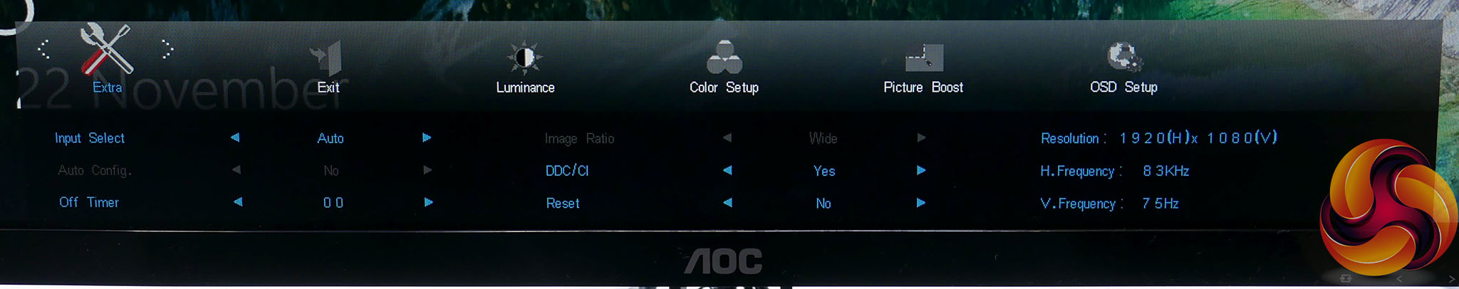One thing that AOC regularly seems to slip up on is the ease of use of its OSD system, and once again that is the case here. The OSD is laid out horizontally and it uses four buttons to move around it: back, left, right and select.