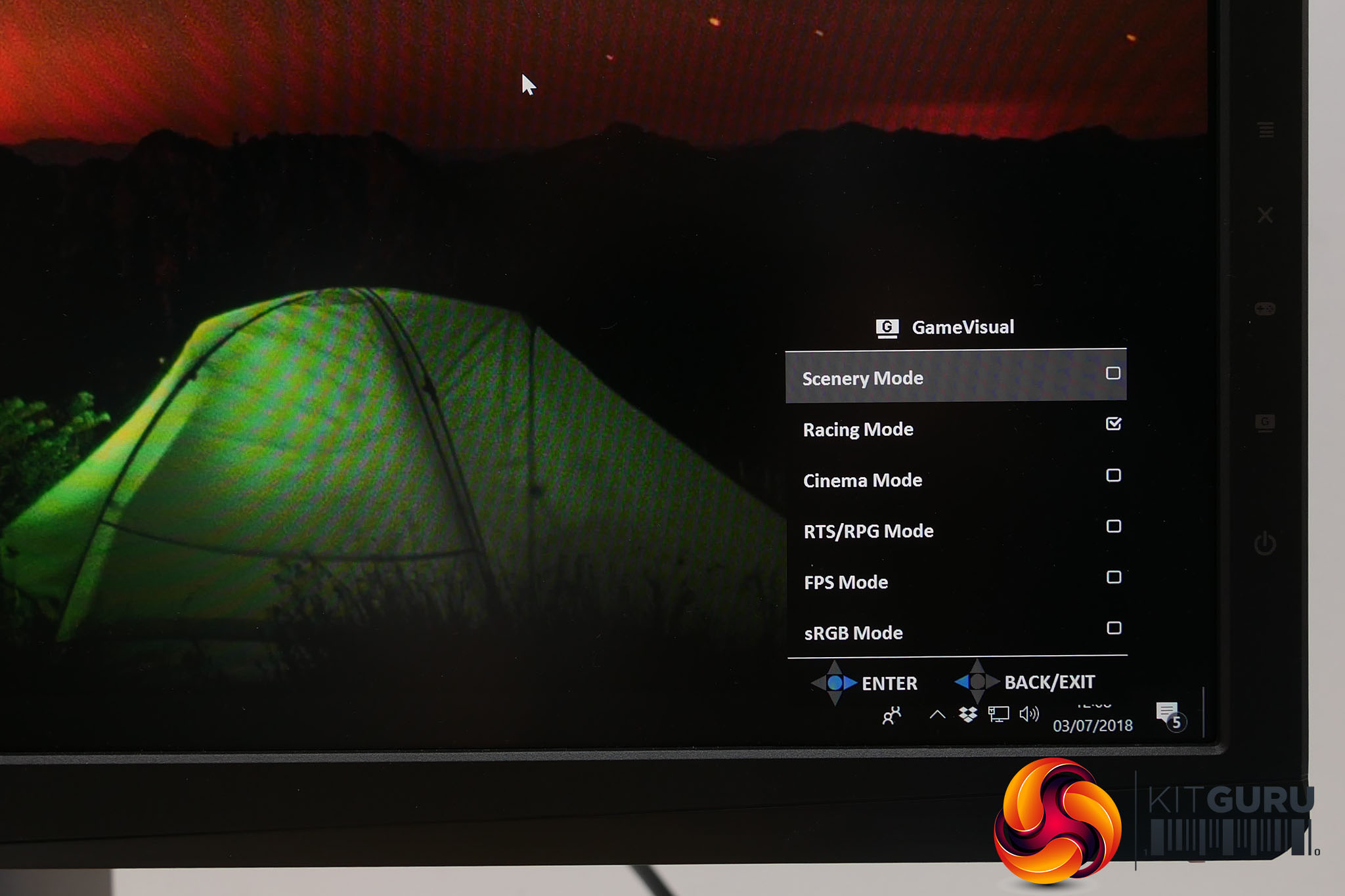 Opt for FPS Mode and the Dark Boost and Over Drive settings are cranked up. RTS reduces the Dark Boost, sRGB Mode enables a pre-calibrated sRGB mode where the brightness and colour settings are all locked out and fixed. All told, we saw no reason not to stick with Racing Mode.