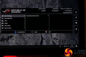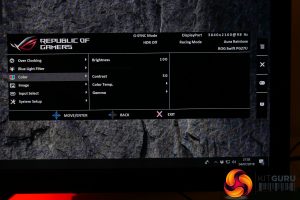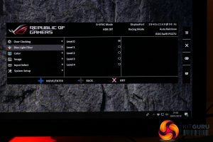 That’s it for the main menu but you also get two further game-oriented menus that should be familiar to those with existing Asus gaming monitors. The GameVisual menu provides a number of presets supposedly tailored for different games. As ever the default is Racing Mode, which seems rather random, but it’s basically the one with the least number of other options enabled.