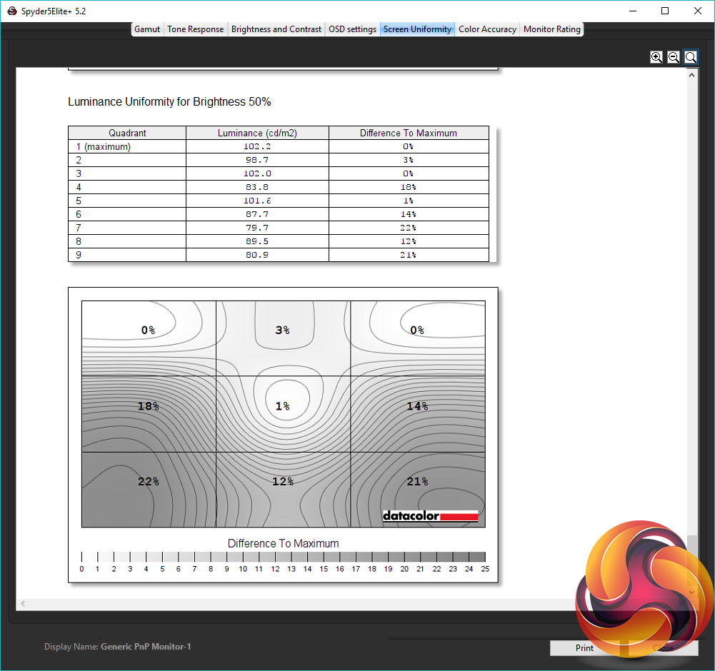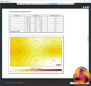 Dropping to 50% brightness – a more realistic brightness setting – and the average doesn’t change too much but the peak variance increases to 22%. That is, the bottom left corner is 22% darker than the top right. Hardly noticeable when gaming but not great for editing pictures or anything of that sort.