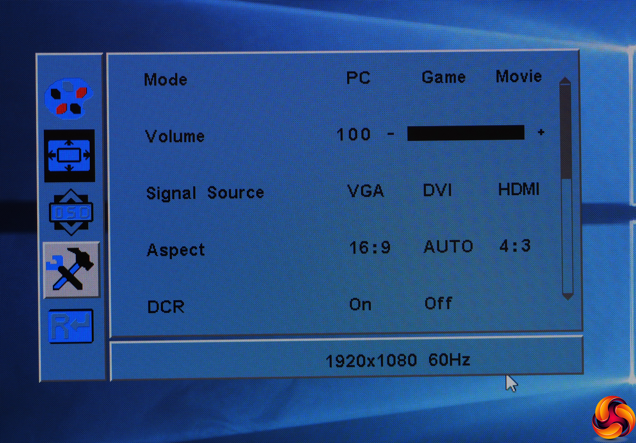 Next along is a setup option where you can invoke the PC, Game and Movie presets, adjust the speaker volume (again), select the video signal source manually (again), force an aspect ratio, and enable dynamic contrast to provide the ludicrous values mentioned in the specification. This works by raising and lowering the backlight to provide a greater perceived contrast than the screen pixels themselves can provide.