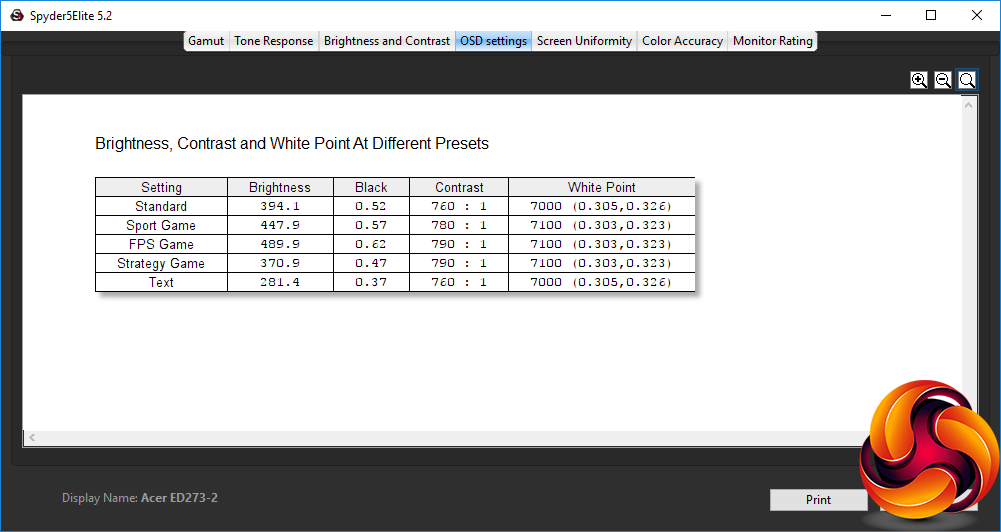 Contrast is fairly consistent, ranging from 760:1 for Text and Standard modes, to 790:1 for FPS and Strategy Games, with Sport Game slightly lower at 780:1. The white point is also consistent, with all the Game modes using a mid-range 7100K, whilst Text and Standard use 7000K.