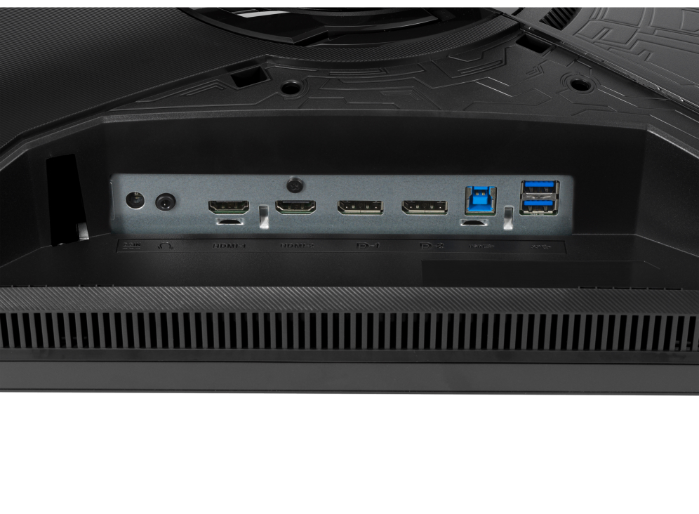 The back of the monitor has a ROG logo with Asus Aura Sync lighting technology that users may synchronise with other Aura-enabled components and peripherals. For connectivity, this monitor includes 2x HDMI 2.0 ports, 2x DisplayPort 1.4, a 3.5mm headphone jack, a USB 3.0 upstream port, and 2x USB-A 3.0 ports. The included stand offers tilt, swivel, pivot, and height adjustments capabilities. It also supports VESA 100x100mm wall mounting.