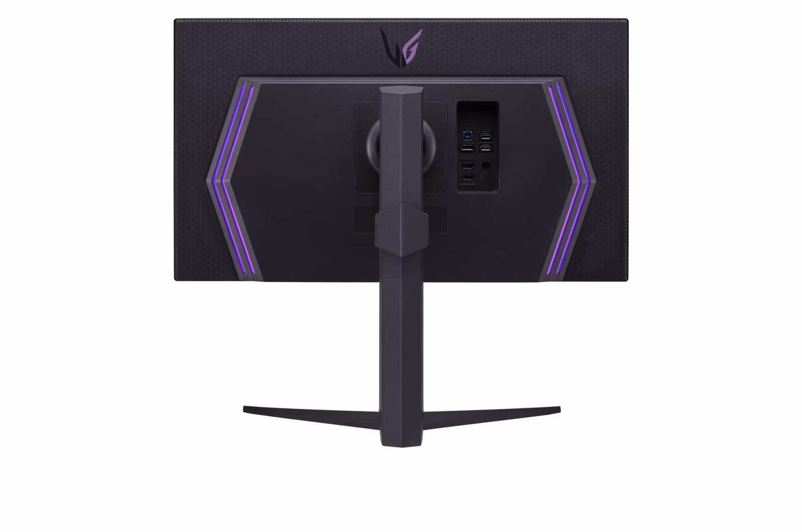 The non-screw attachable stand of LG 27GR95UM has a V-shaped base with rear ambient lighting and can be adjusted in height, tilt, and pivot. The monitor features two USB-A 3.2 Gen 1 ports, a USB-B 3.2 Gen 1 upstream port, two HDMI 2.1 ports, a DisplayPort 1.4 with DSC, and a headphone jack with DTS: X compatibility. It is both Nvidia G-Sync compatible and AMD FreeSync Premium Pro-certified.