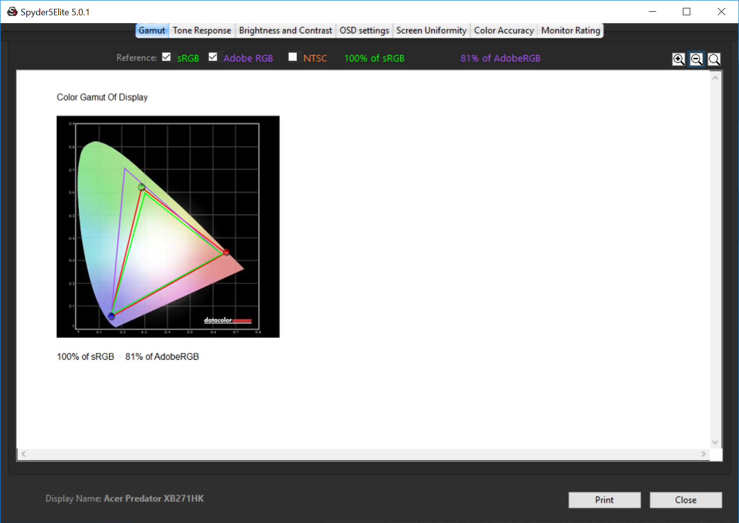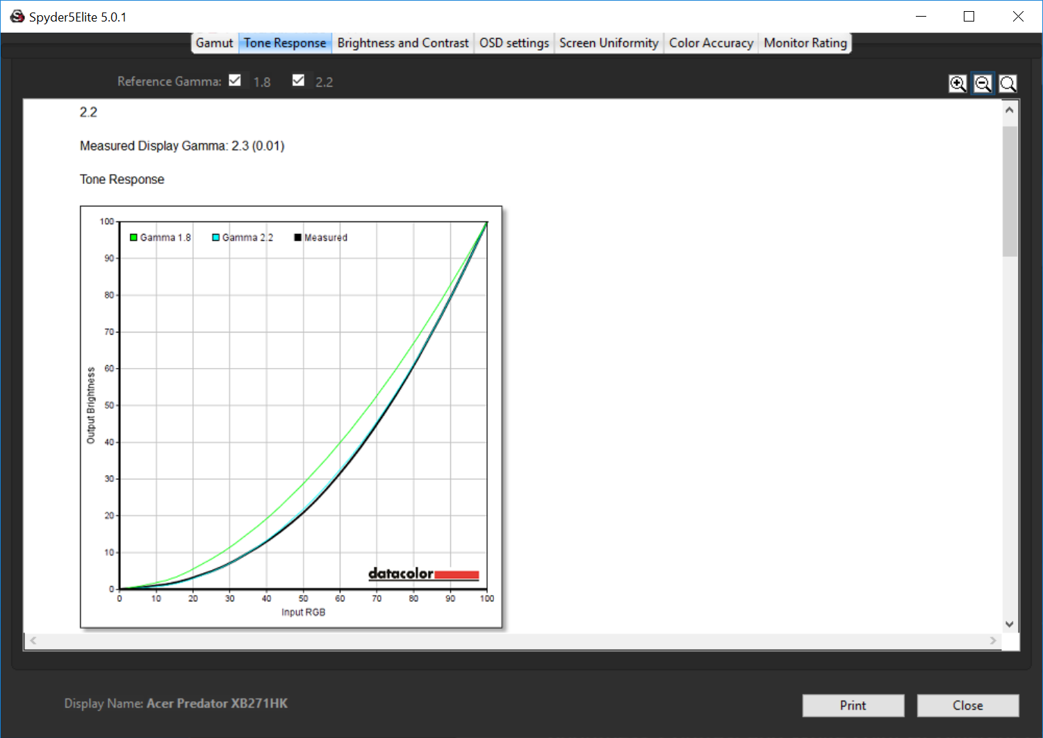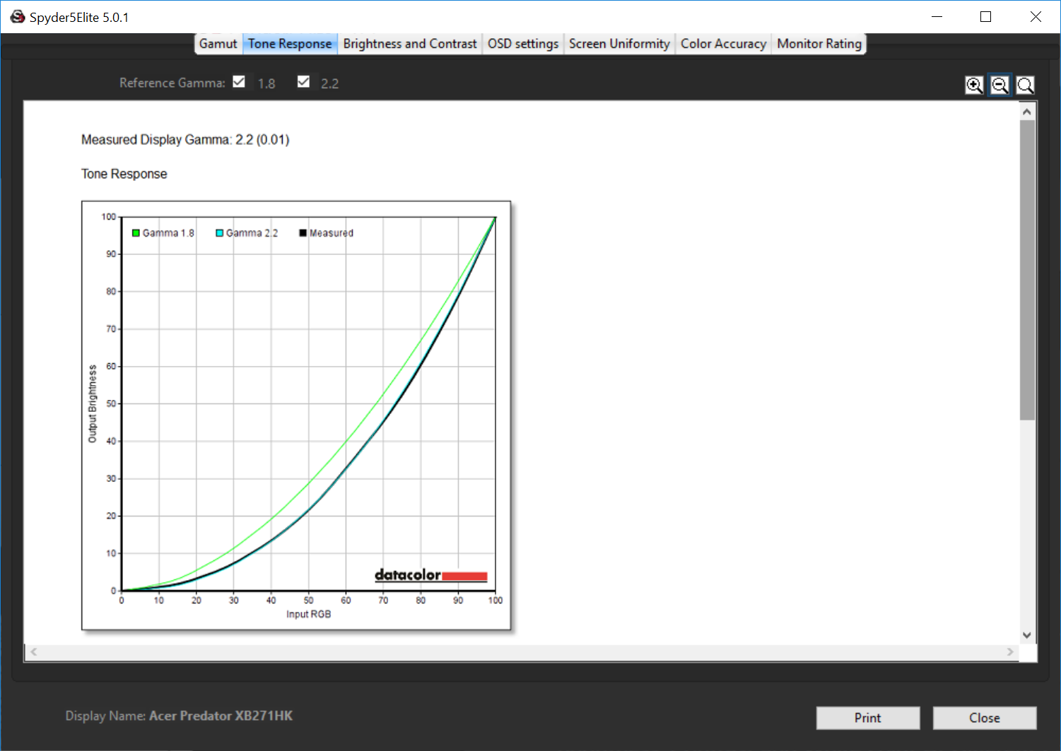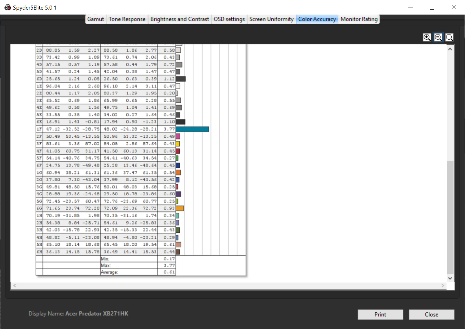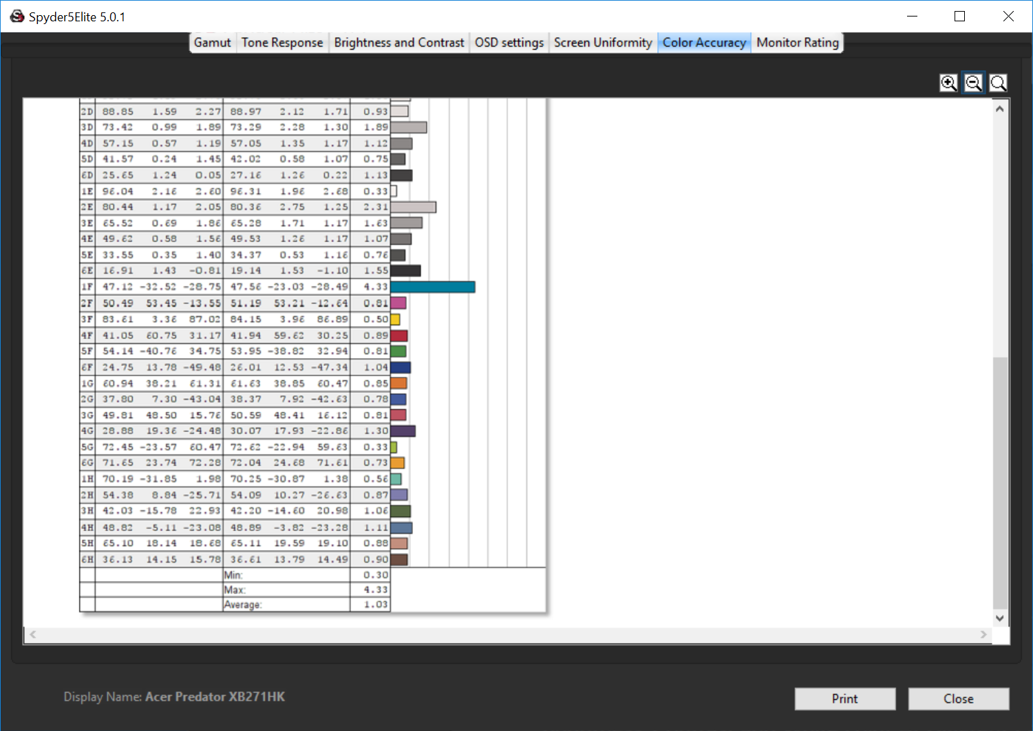 And the accuracy hits a Delta E below 1, a truly awesome result that means the Acer Predator XB271HK is a good and workable screen for graphic design, although entirely expected for a 10-bit panel (1.07 billion colours).