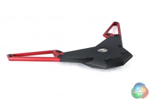 With the screen upright, you can see the stand better, with its sharp angles and red metal edges. It measures around 40cm from left to right and around 20cm from back to front.