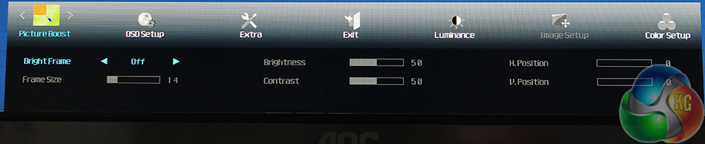 The Picture Boost menu features the same Bright Frame feature we saw on the AOC Q2778VQE, where a patch of the screen is illuminated. You can choose where this will be, again via the H.Position and V.Position, with settings to adjust its size, brightness and contrast.