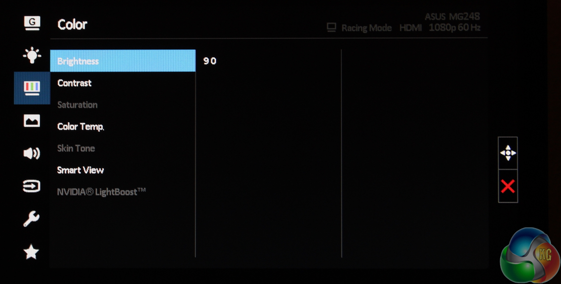 The main menu screen is a list of the GameVisual presets, a set of predetermined picture settings, with Racing Mode set to default, which is fairly standard on all Asus gaming displays. There are also settings for Cinema, Scenery, sRGB mode, FPS and RTS/RPG. We'll use a colorimeter to see exactly what each one looks like on the next page.