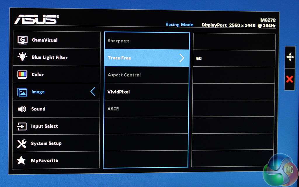 The Image menu provides options for Sharpness, Trace Free, Asus VividPixel and ASCR. With some GameVisual presets, many of these options are greyed out.