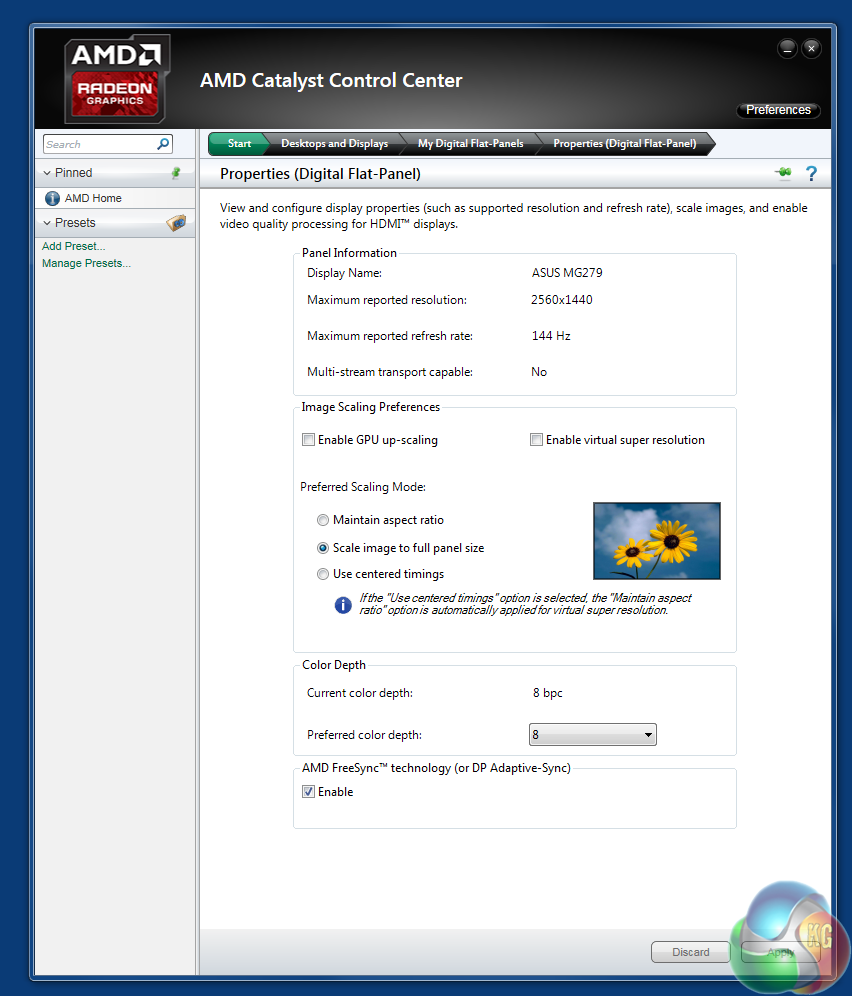 To enable FreeSync in games, the setting in the Image menu of the monitor’s OSD needs to be turned on, along with a setting in AMD’s Catalyst Control Center (buried at the bottom of the page in Digital Flat Panel properties).
