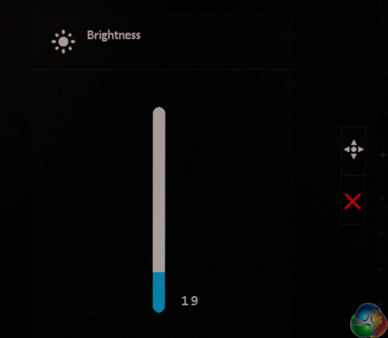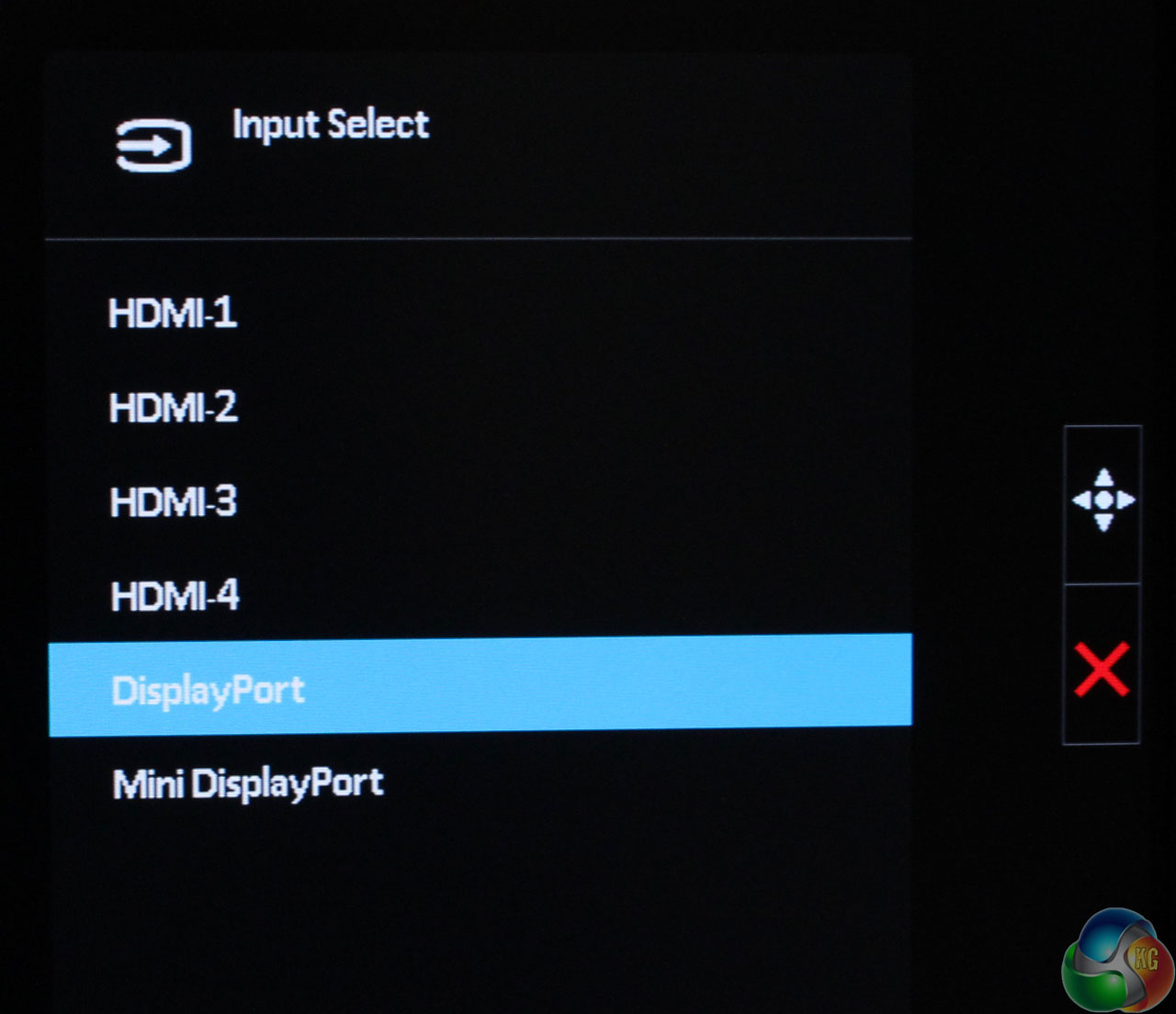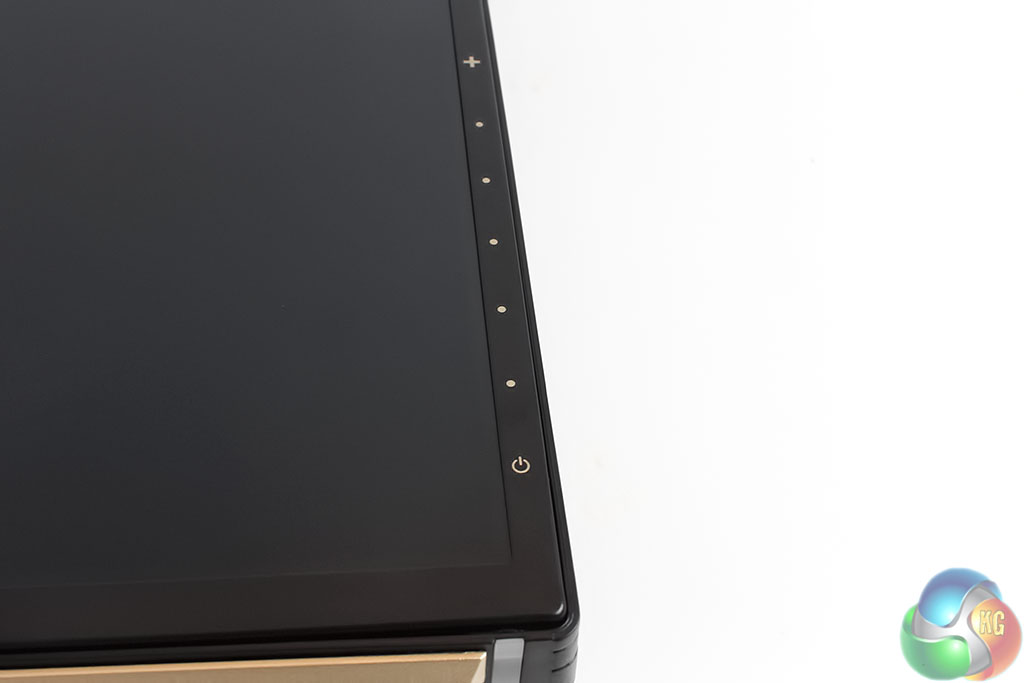 The on-screen display (OSD) is controlled using a 5-way joystick and six physical buttons, the lowest of which powers on the display. On the front of the bezel are aesthetic indicators to guide the user to the position of each button.