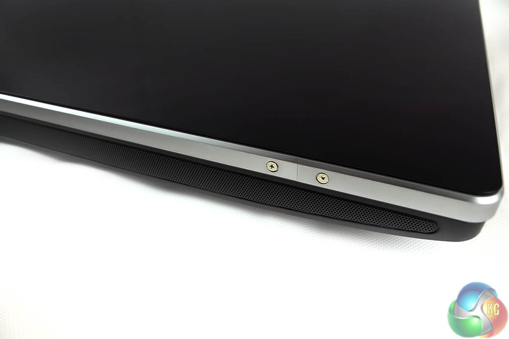 The screen is covered in glass and there’s a metal trim running along the edge.