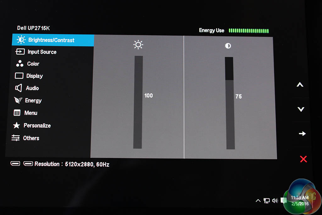 The main menu shows the current resolution of the monitor, the input method in use and the refresh rate in the lower left-hand corner. In the top-right is an estimate for power consumption, based on the current brightness setting.