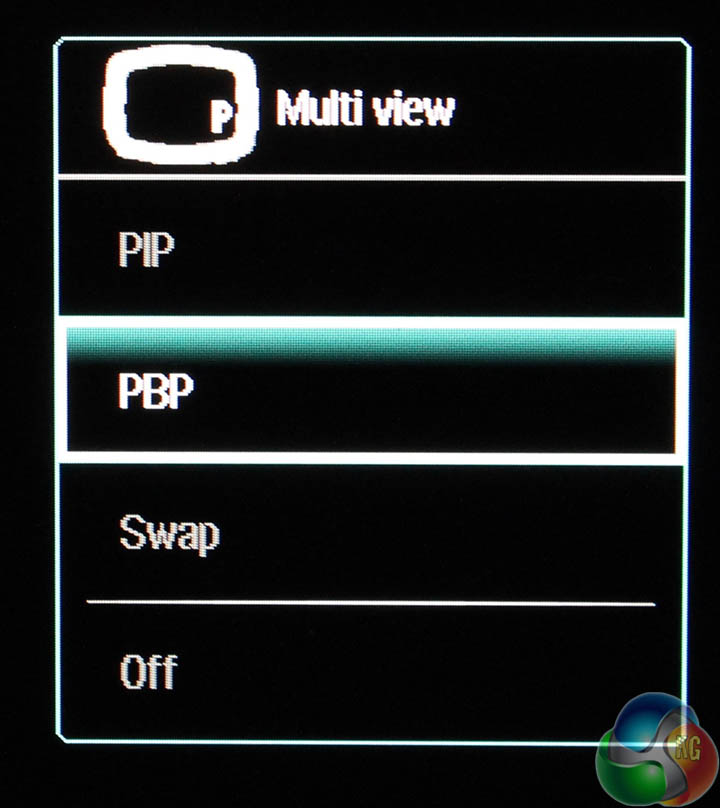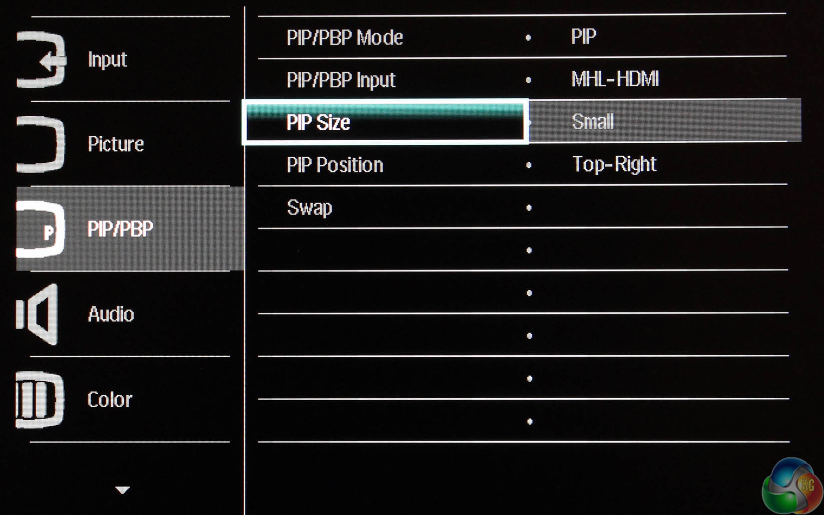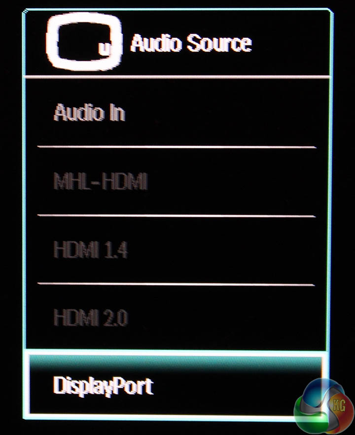 Press down to choose the audio source, useful when running in PIP mode, so you can switch from PC audio to (for example) the audio of a games console.