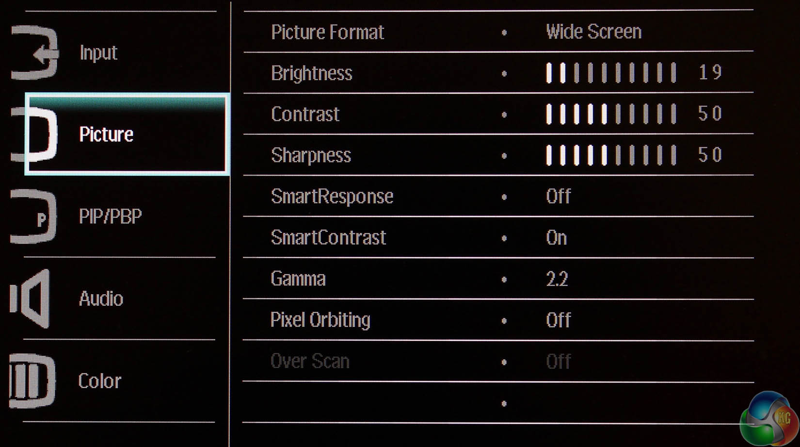 Beneath this is the Picture menu, with brightness, contrast and sharpness controls. The aforementioned Picture Format control is here to force a 4:3, 16:9 or 21:9 screen format. There’s also a gamma setting with values ranging from 1.8 to 2.6 along with SmartResponse and SmartContrast.