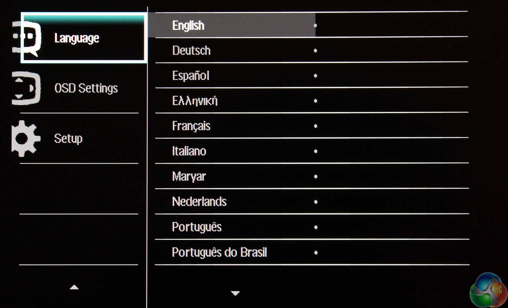 There’s a choice of languages. The OSD Settings menu lets you adjust the OSD location, timeout and transparency.