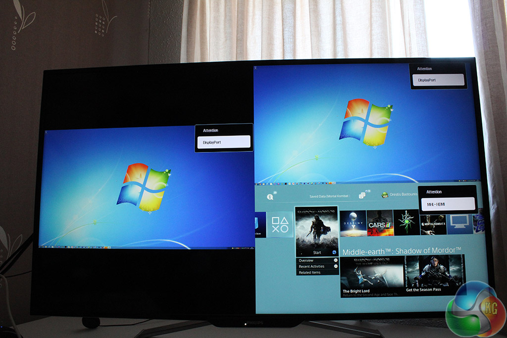 In this image, in the top left the BDM4065 is acting a secondary display for a Mac, with a PC’s main display output in the top right. In the bottom left is a PS3, and in the bottom right, a PS4.