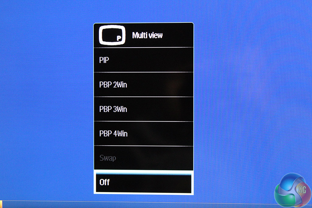 Pushing the joystick upwards brings up the Multiview menu, where you can turn on PIP/PBP, including 4-way PBP mode.