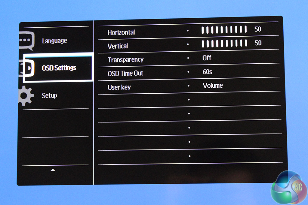 There’s a language menu and a set of OSD settings, allowing you to relocate the on-screen display and change the timeout period. The option at the bottom labelled User key is where you choose what function is activated when pressing downwards on the joystick.