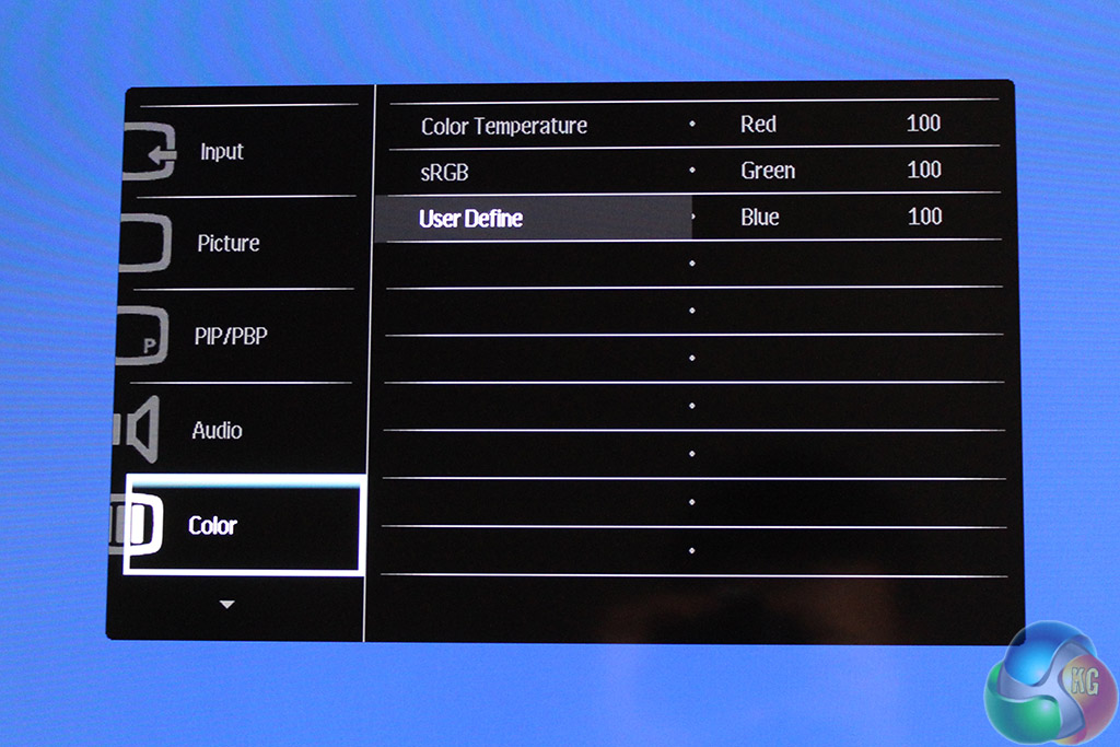 In the Color menu are a few useful settings. You can change the colour temperature from 5000K all the way up to 11500k, although we left this at the standard 6500K.