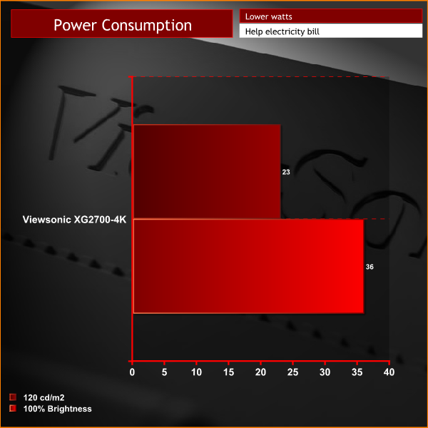 These results are also very good. Some 4K displays can hit well over 50w when at 100% brightness, but the Viewsonic XG2700-4K is very modest in its requirements, and when calibrated to 120cd/m2 base level, it sips power that you would expect from a 1080p display, not 4K. Highly impressive.