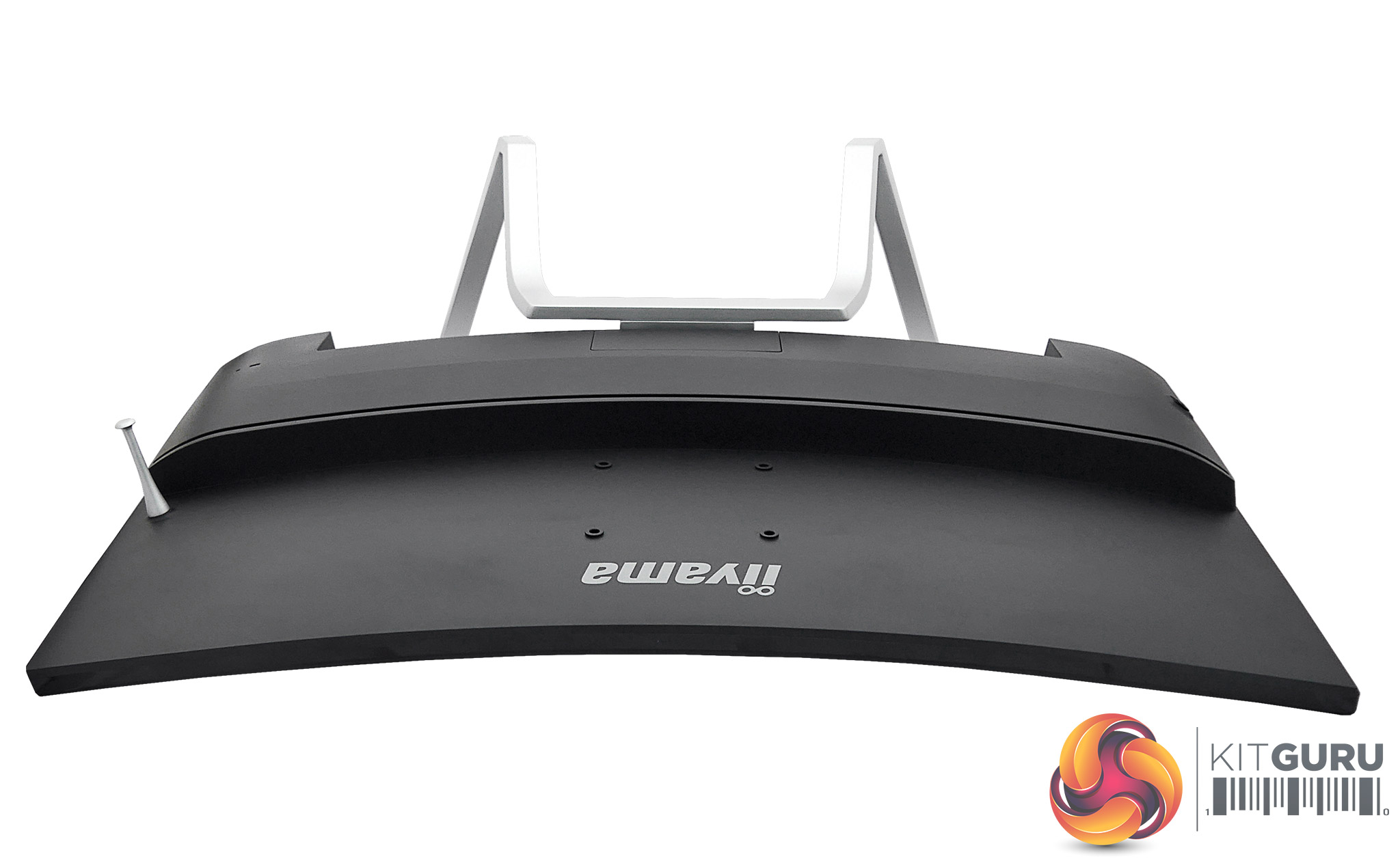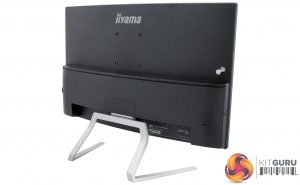 The chassis of the screen itself is nothing too exciting yet holds up well. It sports a matt, lightly textured black finish that doesn’t show dust or fingerprints easily. The top and side bezels are relatively slim at around 1cm, though you need to add a few mm for an internal border. The bottom bezel comes in at just a smidge over 2cm, and is decorated with a few cheap and cheerful (and most importantly, removable) stickers. Iiyama has kept the top half of the monitor’s casing quite trim, at around 2cm again, but for the bottom half – which houses the speakers, connections and sundry – that extends to around 5.5cm.