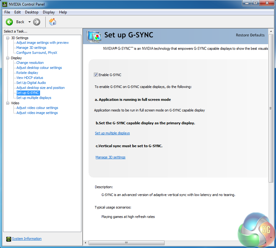After the drivers were installed we went to set up G-SYNC. It was already enabled. We went into Manage 3D Settings and checked in the Vertical Sync options that G-SYNC was enabled.