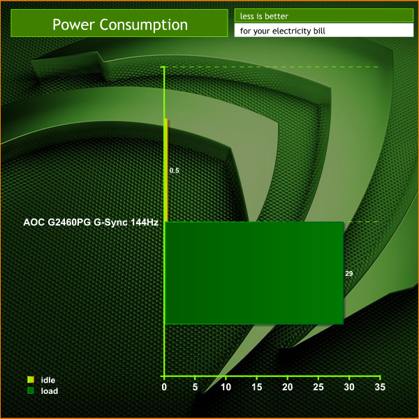 The AOC G2460PG G-Sync 144Hz demands around 30 watts under load. This drops to 0.5 watts when in an idle state.