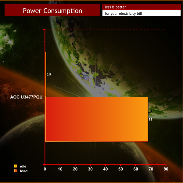 The screen consumes around 0.5 watts under standby. This rises to 68 watts after our calibration.