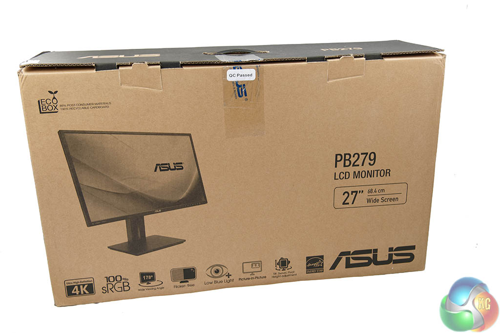 The Asus PB279Q ships in a large plain looking brown box with an image of the monitor, alongside some specifications. The box dimension is (WxHxD): 753x452x224 mm – and it weighs around 10kg all in.