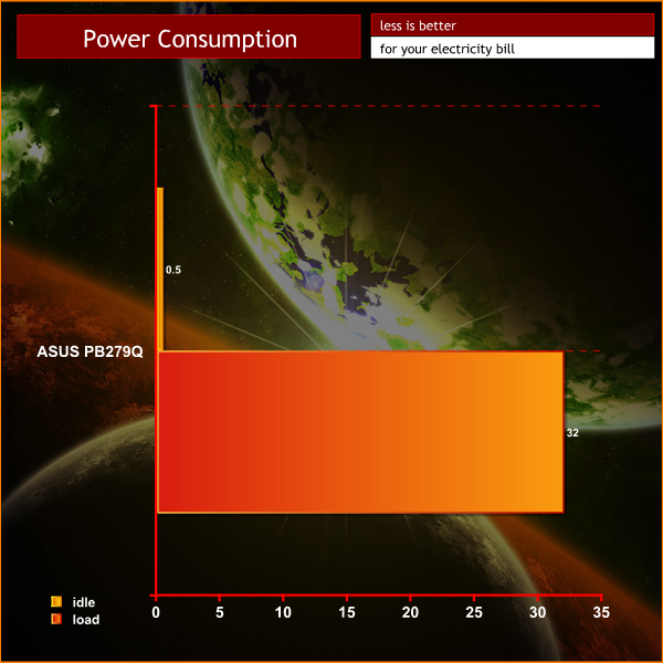 The monitor consumes close to 50 watts when active, with the brightness at 90%. After our calibration, this dropped to around 30 watts when active.
