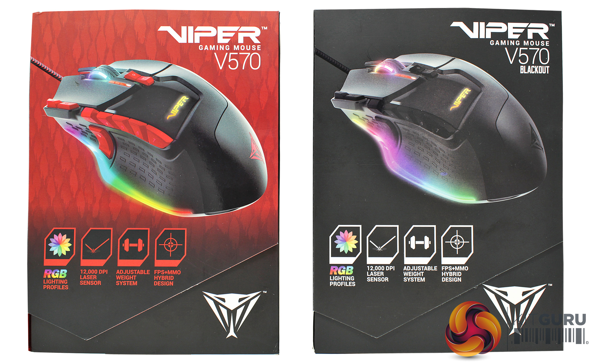 The Viper V570 ships in Patriot's signature red and black theme, clearly displaying the product in the upper centre, while the product name and Viper logo sit around it. The front cover opens like a book, showcasing the physical mouse inside, alongside an index of information about the device. The only difference for the Blackout Edition is that the packaging comes in a sleek jet black box instead.