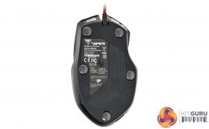 Flipping the mouse over, the design is slightly plain, showcasing the product information and its Avago ADNS 9800 laser sensor. One of the most unique aspects of this mouse is the five ceramic foot pads, a feature that has only been seen on a handful of mice in the past.