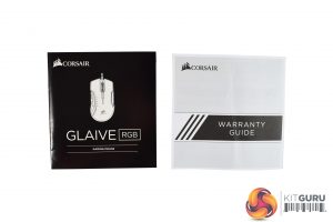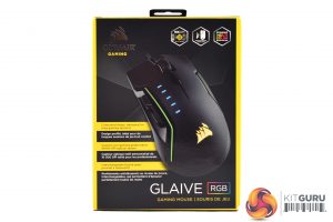 The Corsair Glaive RGB ships in a black box, complete with the classic Corsair yellow accents. A large photo of the mouse itself dominates the front of the box.