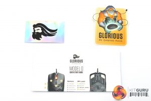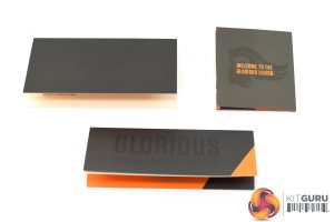 Inside, there are lots of accessories – including two stickers, a quick start guide, a welcome card, a second welcome note from Glorious CEO Shazim Mohammad, and finally a small leaflet detailing other Glorious products.