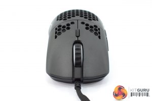 At the front of the mouse, we can see the single DPI button just behind the textured scroll wheel. The primary buttons have comfort grooves built into them.