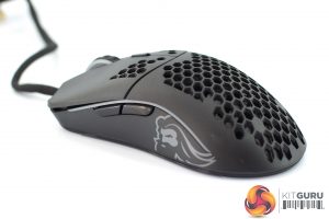 On the left and right side of the mice, we find two RGB LED diffusers – we will look at the lighting itself on the next page. The right-hand side is otherwise bare, but there are two side buttons on the left side of the mouse, as well as the Glorious Odin logo printed towards the back. There are no holes on the sides either, with the holes just on the top and underside of the shell.