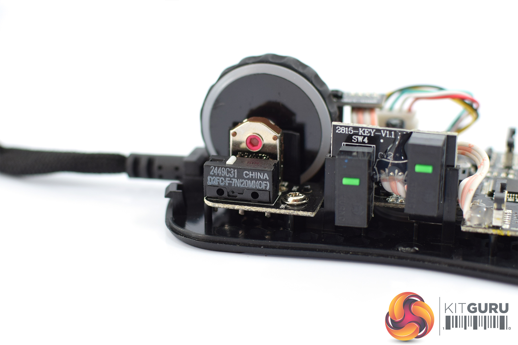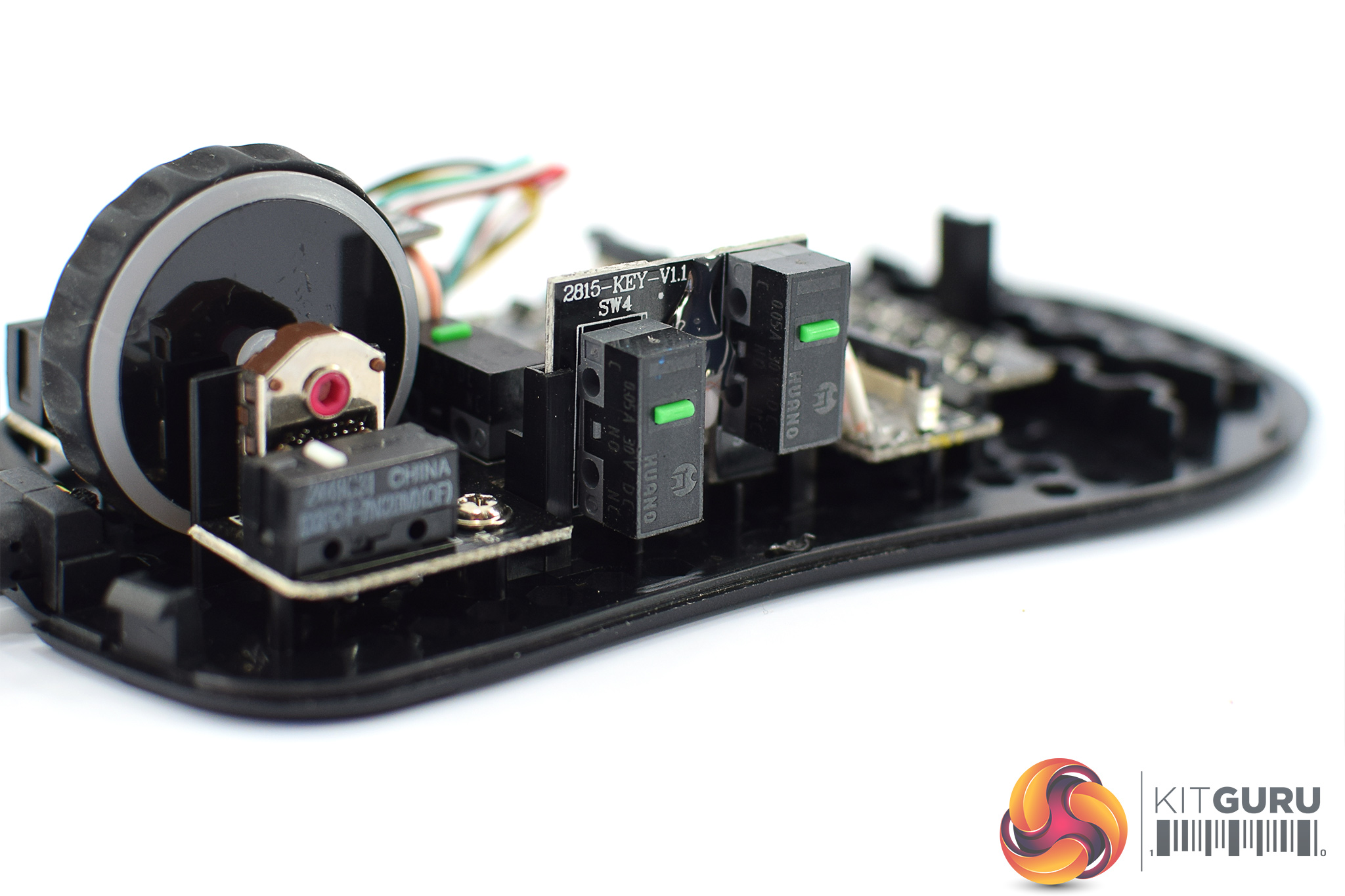 We can also get a look at the brown F-Switch scroll wheel encoder, while the side buttons (plus scroll wheel click and DPI button) use Huano green switches.