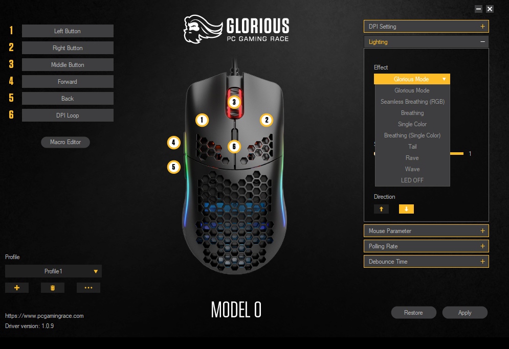 The Model O- uses exactly the same software suite as the bigger Model O, and you can download it directly from Glorious here. It's a pretty basic software suite, with all the options presented on a single page, but there are a number of drop-down menus on the right hand side which offer various customisation options.