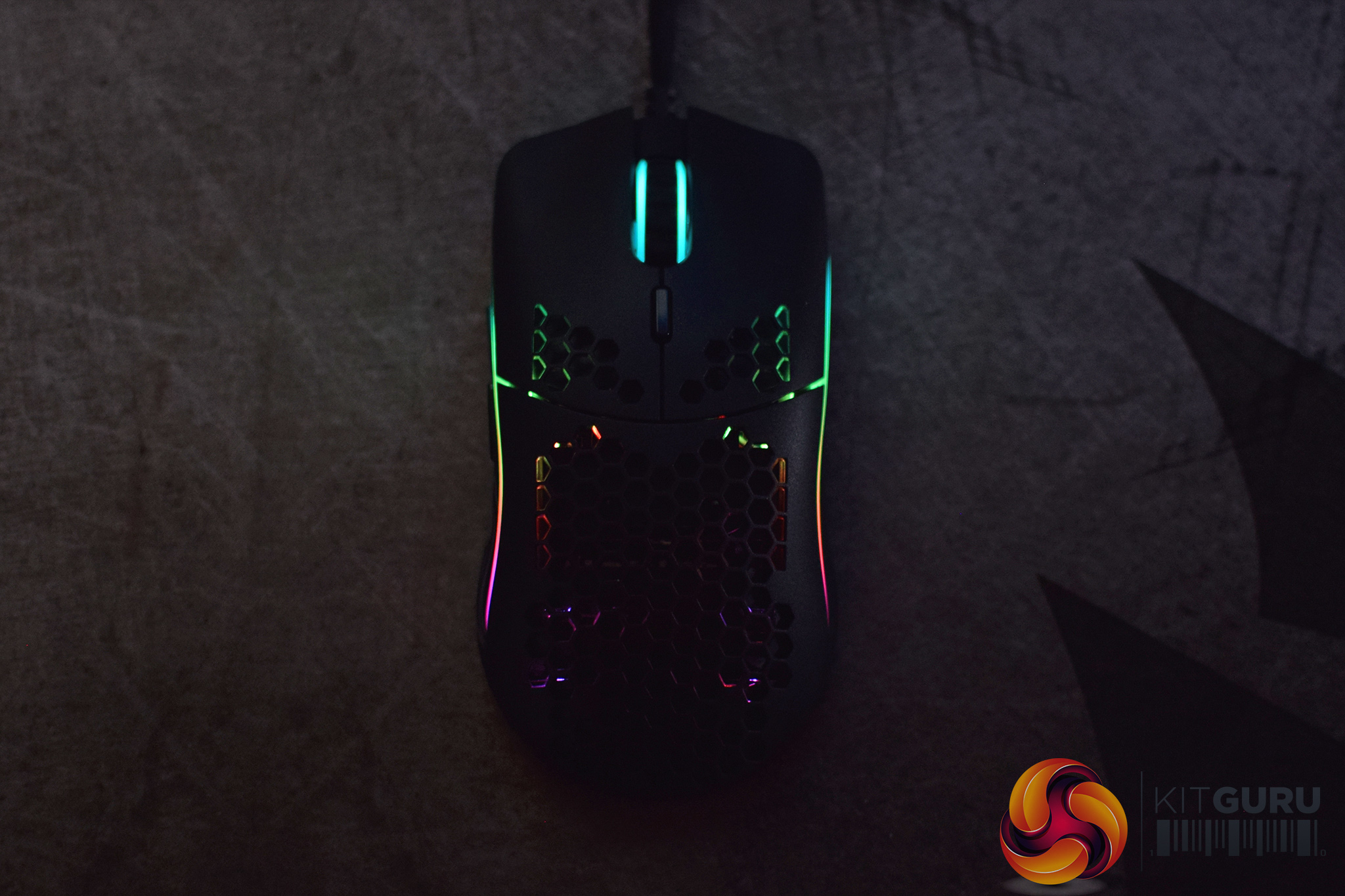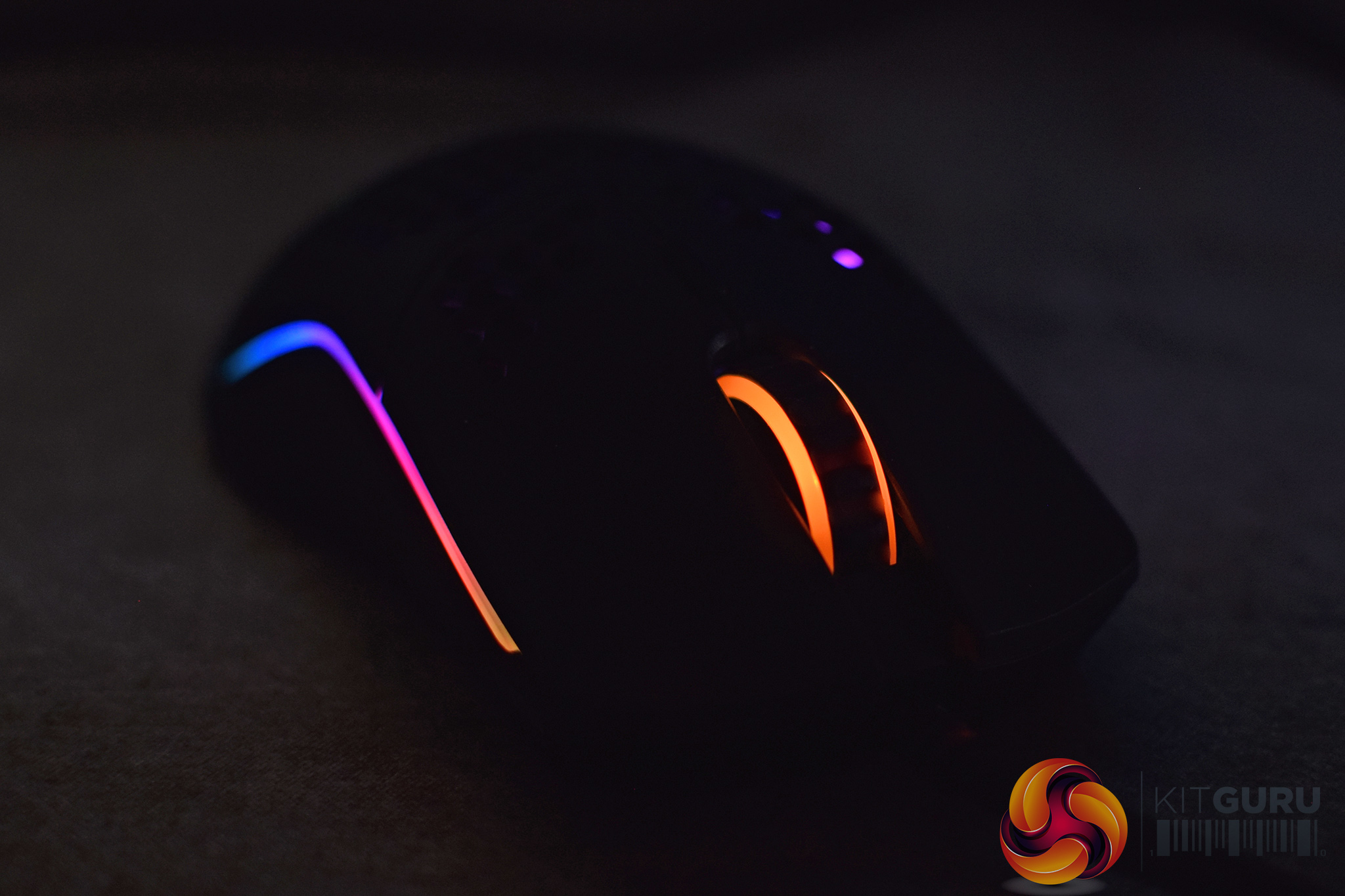 Lighting for the Model O comes from three zones – one LED strip on either side of the mouse, and then the scroll wheel. I do think it looks good, particularly when the lighting bleeds through the honeycomb holes on the top of the shell – it's an appealing aesthetic. On top of that, the LEDs are fairly bright and the colours look good, so I can't really complain here. You can of course turn the RGB off if you want to – some might even go as far as removing the LED diffusers to reduce the weight by a couple of grams – but for most people the RGB lighting will be plenty sufficient.