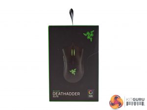 The Razer DeathAdder Elite ships in a black box, though there is photo of the mouse visible from the front.