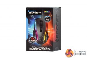 The Roccat Kone EMP ships in a very bright and colourful box, with a large product photo on the front.