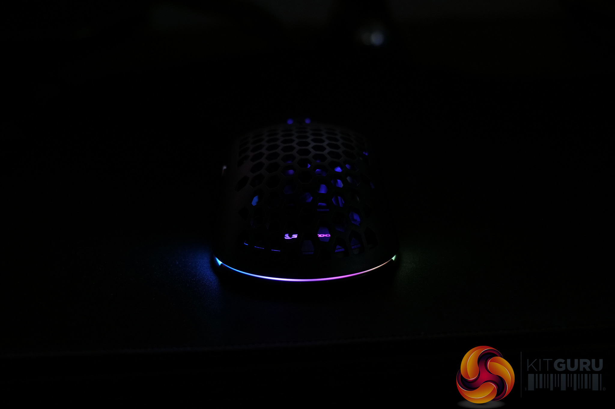 There's three different areas with RGB lighting on the Light2 180 – the scroll wheel, the Sharkoon logo underneath the top shell, and a small LED strip at the very back of the mouse. All three areas are treated as a single zone however, so you can't set the scroll wheel to one colour and the Sharkoon logo to another.