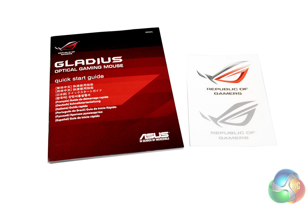 Along with the mouse itself, you get the usual quick start manual, which is in more languages than I can count and a pair of Republic of Gamer (ROG) stickers.
