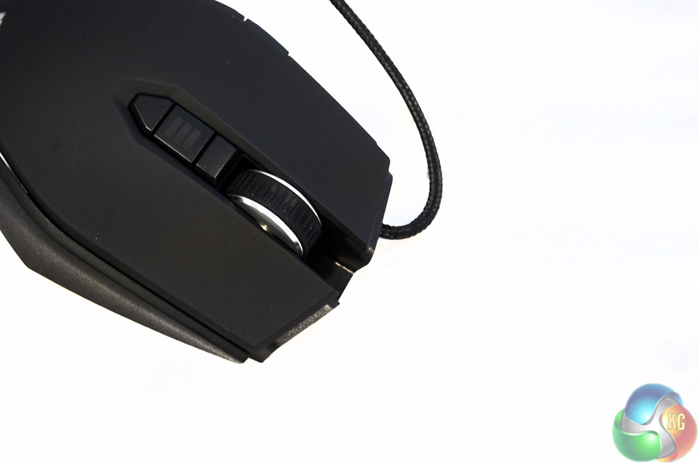 Sitting just behind it are two buttons, DPI up and down, with an LED indicator in-between the lights up when the mouse is powered on (see next page).