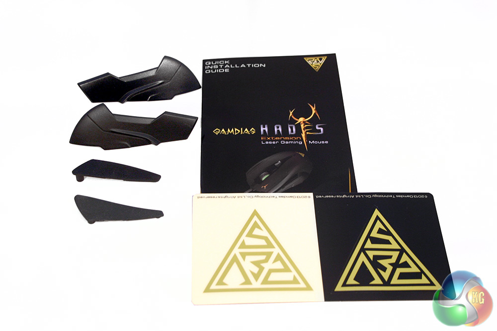 Bundled along with the mouse itself, is a pair of Gamdias stickers, a quick start manual and several finger grip options.