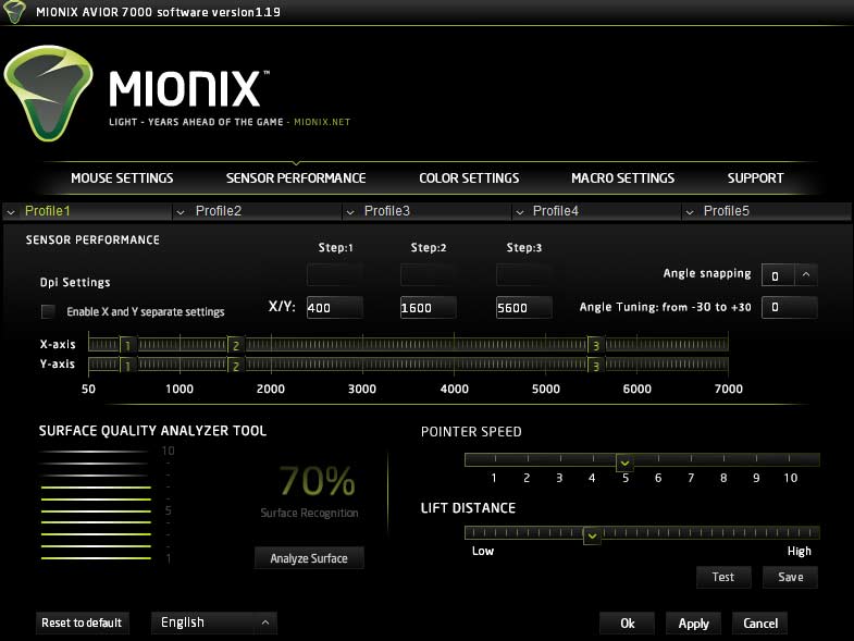 There's a lot on offer in this software suite, including X and Y fine tuning for DPI settings, pointer distance, lift distance and even a surface analyser tool which will tell you how competent your mouse pad is. Ironically the old Mionix pad I'm using only scored 70 per cent.