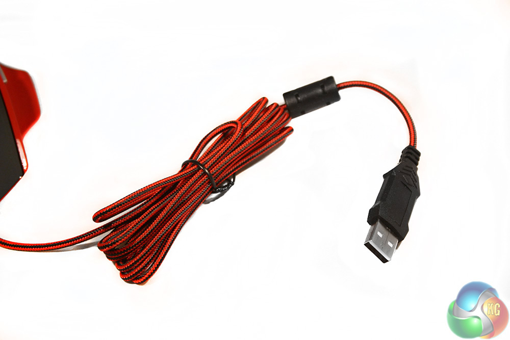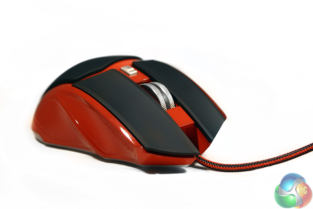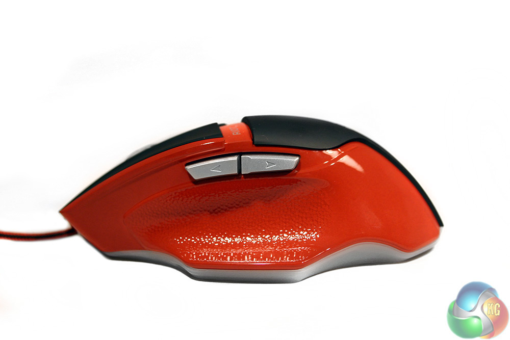 This being a seriously ergonomic mouse, the sides are rather distinctive. The left features a deep thumb rest and a texturing to the red plastic to help with grip during perspiring gaming moments. There are also a couple of typical side buttons, offering forward/back functionality in-browser at default.