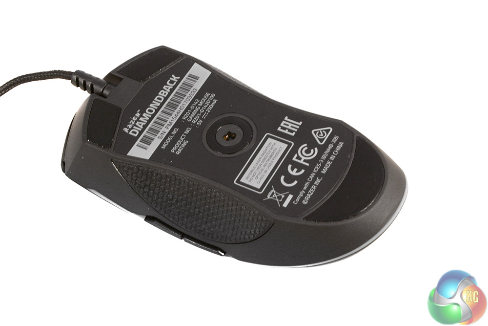 Side on you can see how low profile the Diamondback is; this is not a mouse for palm grippers. Both sides are also identical, featuring the same rubber finger/thumb grip which extends deep under the overhang of the upper body, making much of it inaccessible to all but the most slight fingers when in use.
